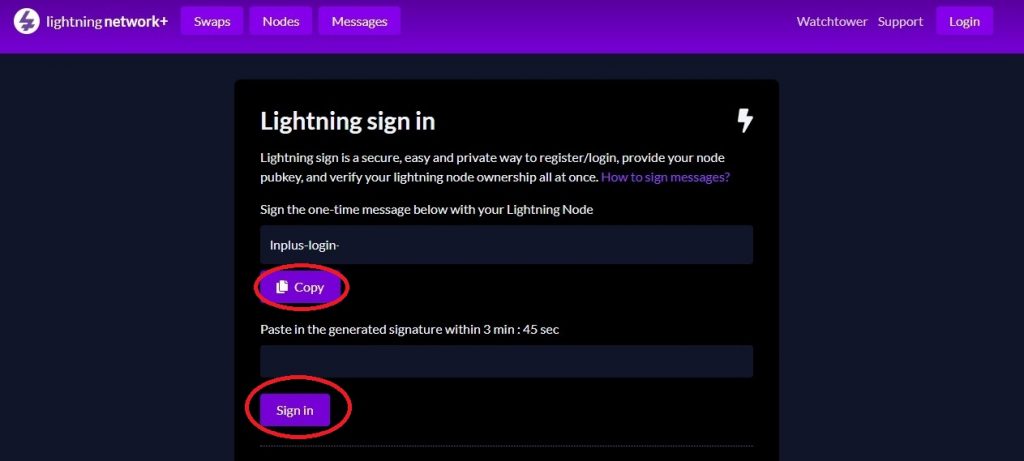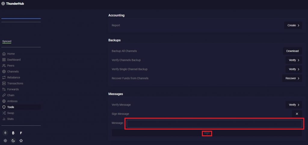 然后打开自己闪电网络节点的“ThunderHub”应用,将拷贝的信息粘贴到下图的”Message”框中,点击”Sign”得到验证信息。再把该验证信息拷贝到上图的相应位置,点击”Sign in”。即可验证成功,完成登录。