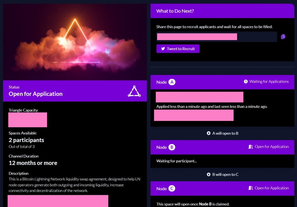 下图以3对交换为例。交易对建立之后,需要等待其他两位参与者加入。此过程一般需要等待几个小时左右。用户自己是下图的Node A,等待Node B和Node C加入此交易对。