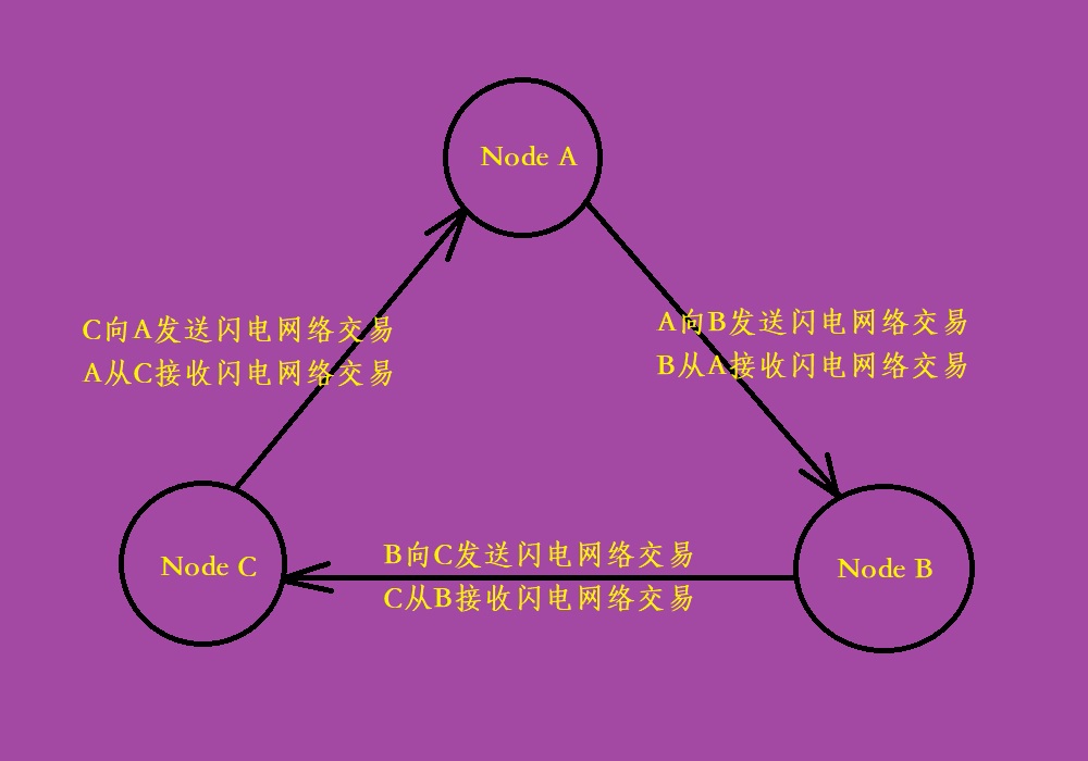 Node B加入后,用户即可向Node B建立出通道。Node B向Node C建立出通道,Node C向Node A建立出通道。上图中Node C已经向Node A开辟了一条通道。用户向下面的Node B节点建立一条通道,即可完成自己的部分。